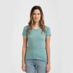 3.7 oz., 50% polyester/25%ring-spun USA cotton/25% rayon Heat-set to minimize shrinkage Side-seamed construction for a slim, feminine fit Ribbedslightly scooped neckline Taped neck to provide durability Double needle stitching on sleeves and bottom hem Tear Anywhere label USMCA Certified